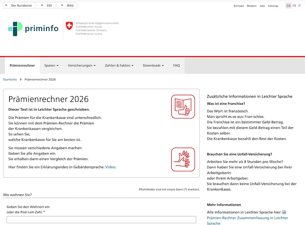 - Vergleiche mit dem Prämienrechner von priminfo welche Grundversicherung für deine persönlichen Daten die Beste ist