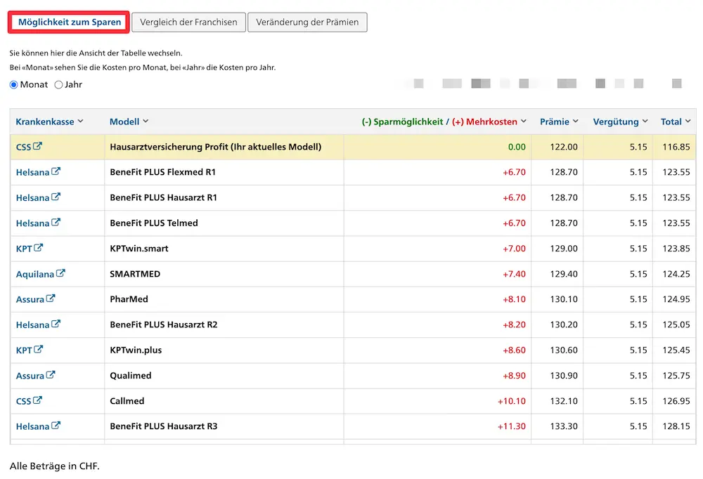 Wie immer habe ich den besten Krankenkassenvergleich der Schweiz genutzt: die offizielle Website des Bundes “Priminfo” (und nicht Comparis oder andere, die gesponserte Prämien mitten in den Suchergebnissen platzieren, mit denen man leicht übers Ohr gehauen wird).
