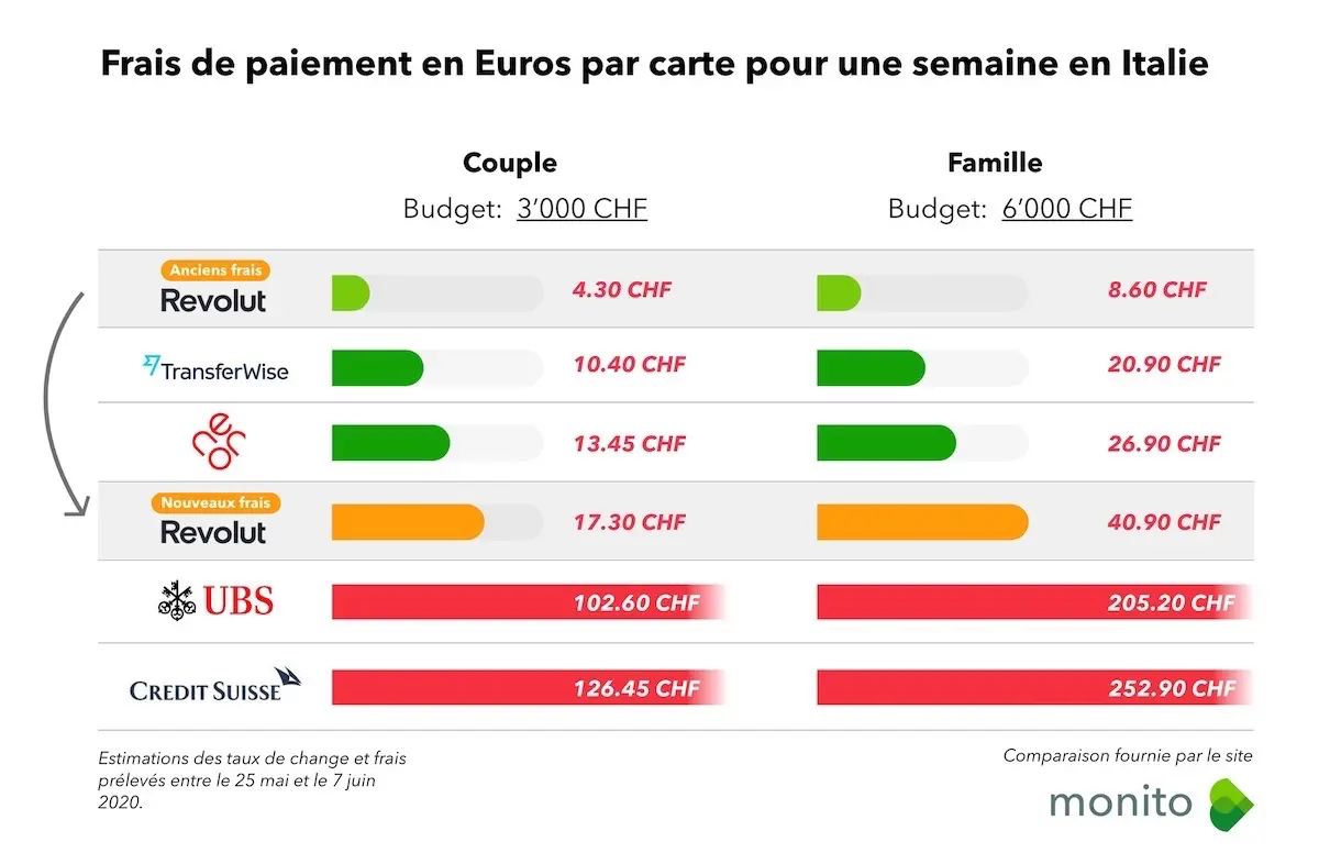- Carte Revolut pour toutes nos transactions en devises étrangères pour avoir le meilleur taux de change possible en Suisse, jusqu’à CHF 1'250 par mois maximum (sinon après les frais de conversion de devises sont trop chers)