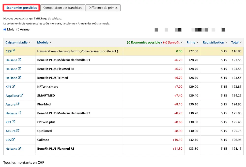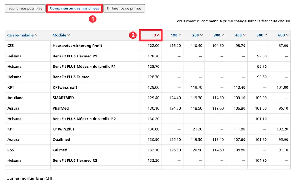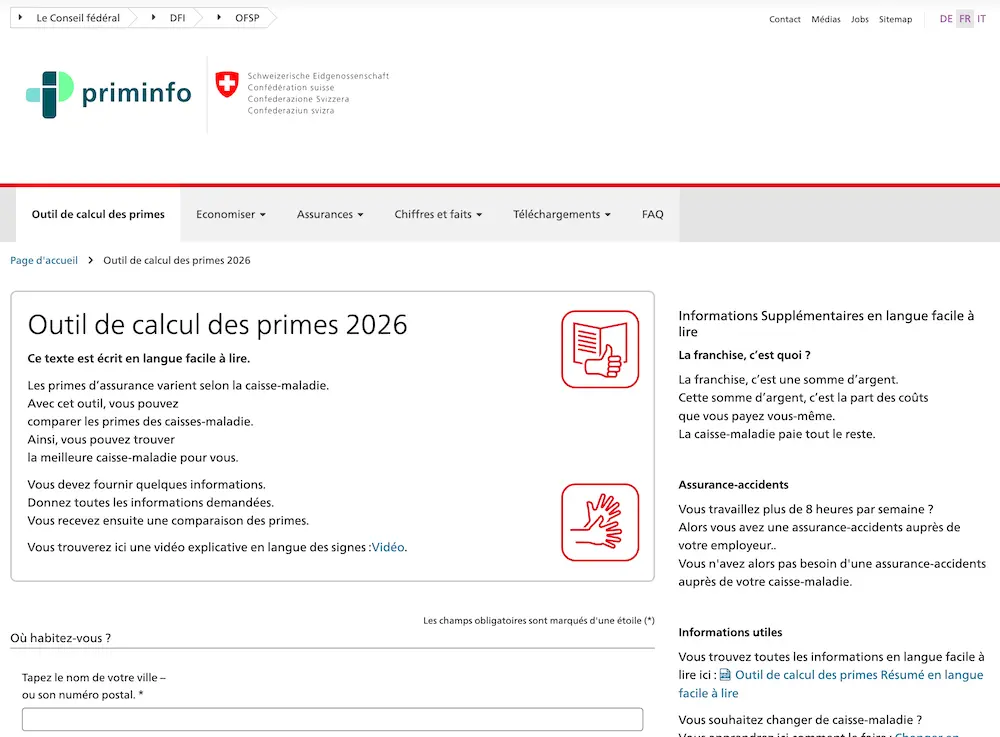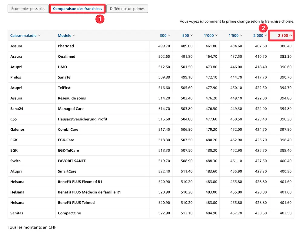 Comme d’accoutumée, je me suis rendu courant octobre sur le meilleur comparatif d’assurance maladie en Suisse: le site officiel de la Confédération “Priminfo” (et non pas Comparis ou autre qui te placent des éléments sponsorisés au milieu des résultats de recherche des offres d’assurance maladie avec lesquels tu peux vite te faire avoir).