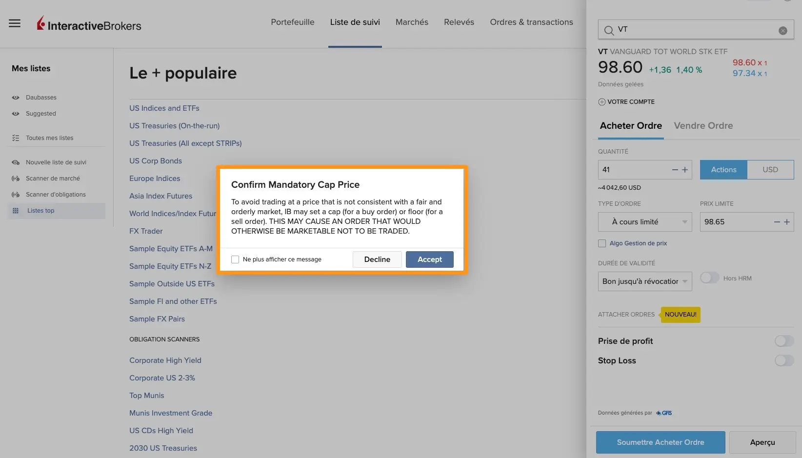 IB me dit que je n'ai pas utilisé leurs données de marché (via leurs news sur leur plateforme) à propos de l'ETF VT, et que c'est inconscient, et blabla légal. Je clique 'Accept' pour continuer de passer mon ordre
